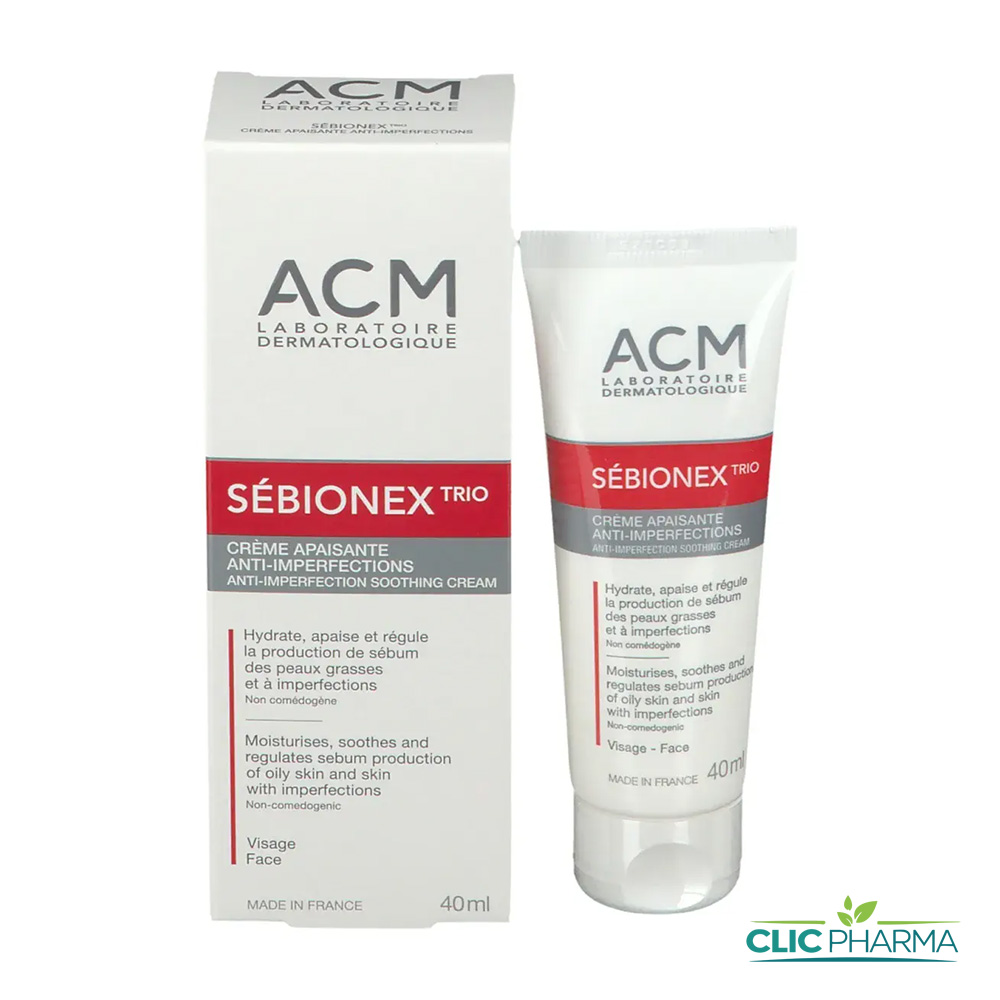 L’ACM Sébionex Trio est une crème de 40 ml destinée aux peaux à tendance acnéique présentant des boutons inflammatoires (points rouges, boutons blancs) et des points noirs. Son nom « Trio » fait référence à sa triple action : anti-imperfections, apaisante et exfoliante.