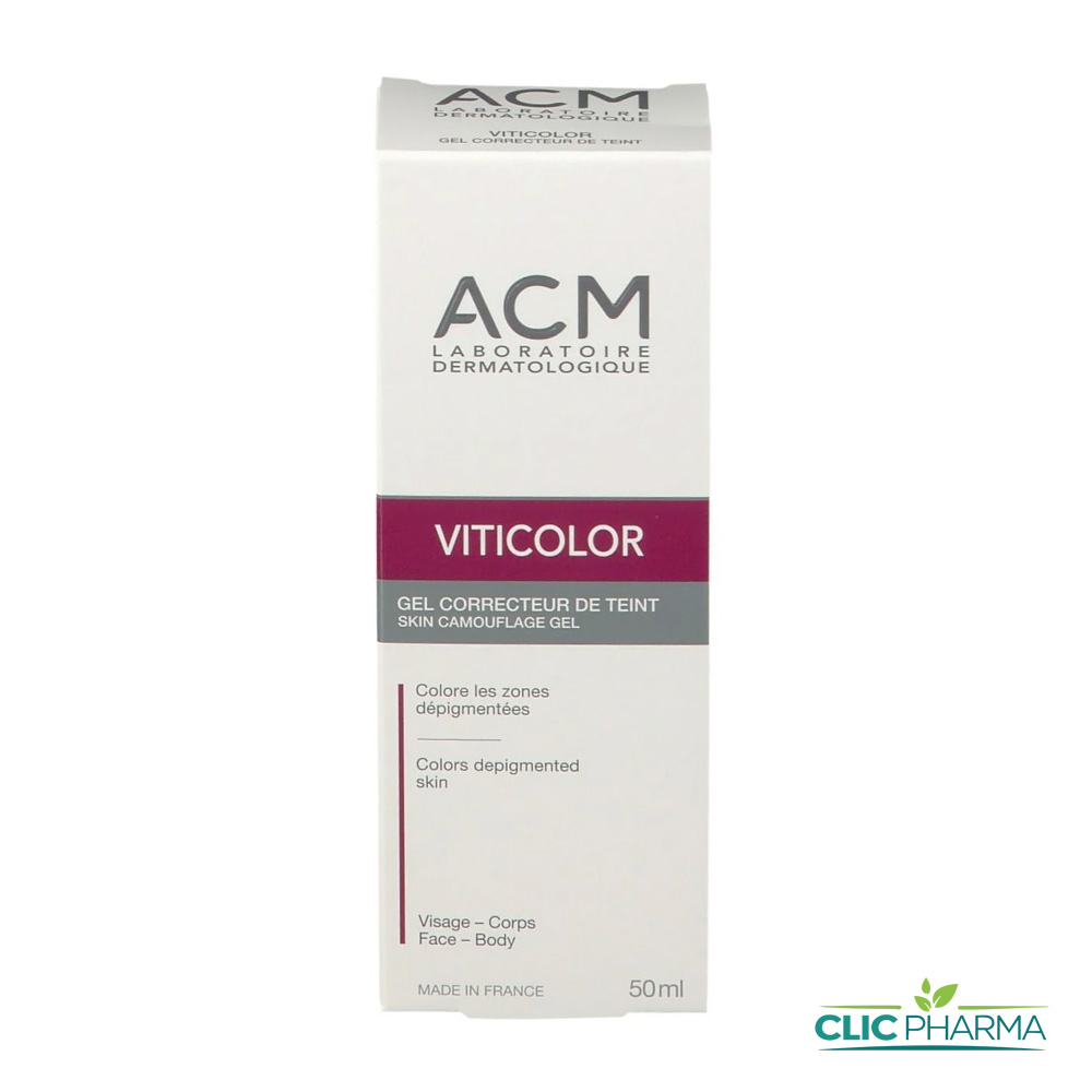 ACM Viticolor est un gel correcteur de 50 ml destiné à masquer les zones de peau atteintes de vitiligo. Contrairement à un fond de teint classique qui s’efface au premier lavage, Viticolor est un agent de coloration longue durée.