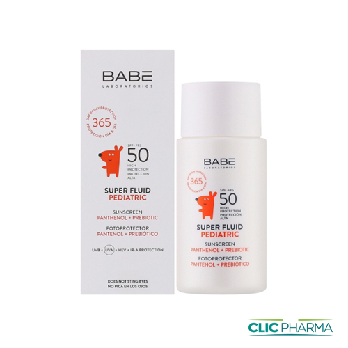 BABE SUPER FLUID PEDIATRIC SPF 50 est conçu spécialement pour les bébés et les enfants, ce fluide solaire haute protection allie SPF 50 et une texture ultra-légère qui s’étale sans effort, pénètre rapidement et ne laisse aucun résidu blanc. Idéal pour les peaux sensibles, il prévient les irritations grâce à sa formule sans picotement (même autour des yeux !) et résistante à l’eau.