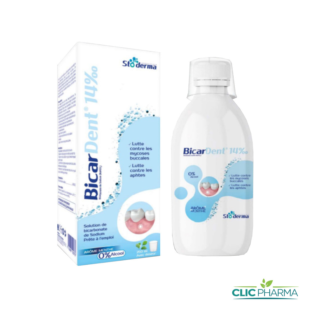 Le Stoderma Bicardent 14‰ Bain de Bouche est formulé avec du bicarbonate de sodium à une concentration de 1,4% (ou 14 pour mille).