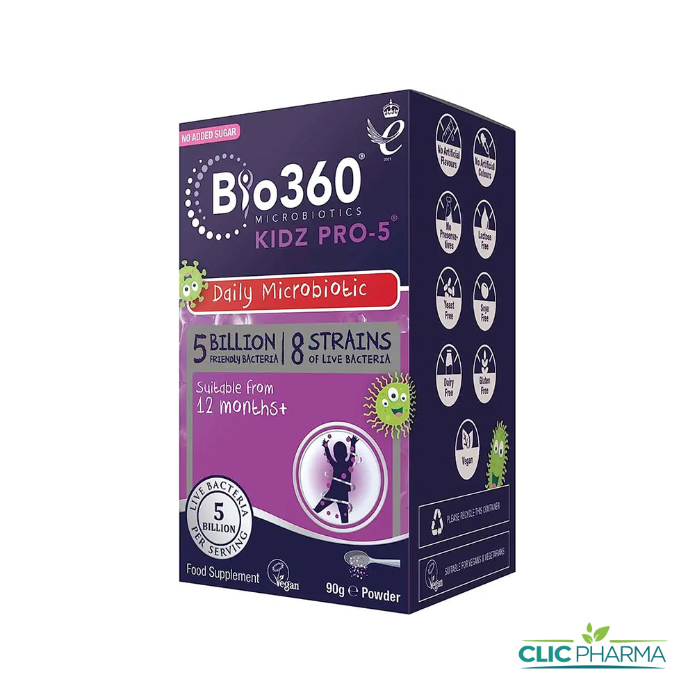 Notre poudre Kidz Pro-5 primée et facile à utiliser contient 5 milliards d’organismes vivants et 8 souches de bactéries soigneusement sélectionnées par nos experts. Il s’agit de Bifidobacterium lactis, Lactiplantibacillus plantarum, Lacticaseibacillus rhamnosus, Streptococcus thermophilus, Lacticaseibacillus casei, Lactobacillus acidophilus sensu stricto, Bifidobacterium infantis et Limosilactobacillus reuteri. Sans arômes artificiels, colorants ou conservateurs, c’est un excellent complément à l’alimentation de votre enfant et peut être ajouté au yaourt ou aux céréales. La poudre ne nécessite pas de réfrigération.