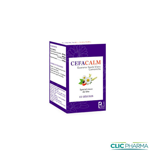 CEFA-CALM EST UN COMPLÉMENT ALIMENTAIRE SPÉCIAL MAUX DE TETE A BASE DE TROIS PLANTES SPÉCIFIQUEMENT SÉLÉCTIONNÉES : LA GRANDE CAMOMILLE, LE GUARANA ET LE SAULE BLANC