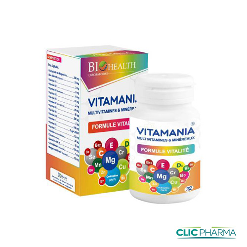 BIOHEALTH VITAMANIA un complément alimentaire riche en vitamines et minéraux pour répondre à vos besoins énergétiques. Notre formule Vitalité réunit 13 vitamines (vitamine C, vitamine D3, vitamine B12, vitamine B7,.), 2 minéraux (Mg, Zn), 4 oligo-éléments (Se, Cu, Cr, Mn), et pour optimiser la vitalité VITAMANIA est enrichi avec la quercétine ; un polyphénol flavonoïde dont les bienfaits sur la santé font l’objet de diverses études.