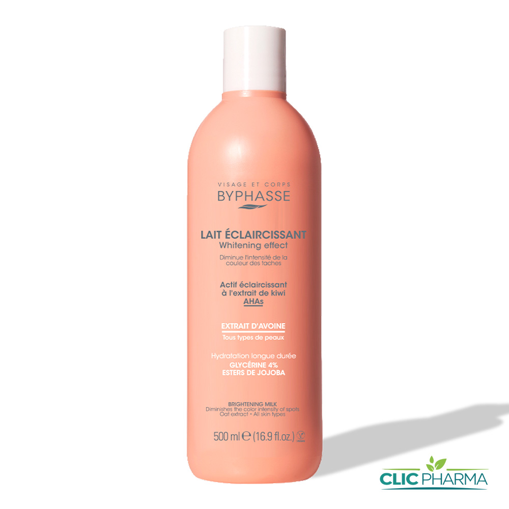 Le lait corporel éclaircissant BYPHASSE est spécifiquement formulé pour atténuer l’apparence des taches brunes et unifier le teint sur l’ensemble du corps, le visage, le cou et les mains. Sa formule haute performance combine des actifs éclaircissants d’origine naturelle avec des propriétés hydratantes pour offrir une peau plus lumineuse et homogène. Grâce à sa texture onctueuse et son absorption rapide, il pénètre au cœur de l’épiderme pour corriger les irrégularités pigmentaires tout en laissant la peau douce et souple, sans aucun fini gras.