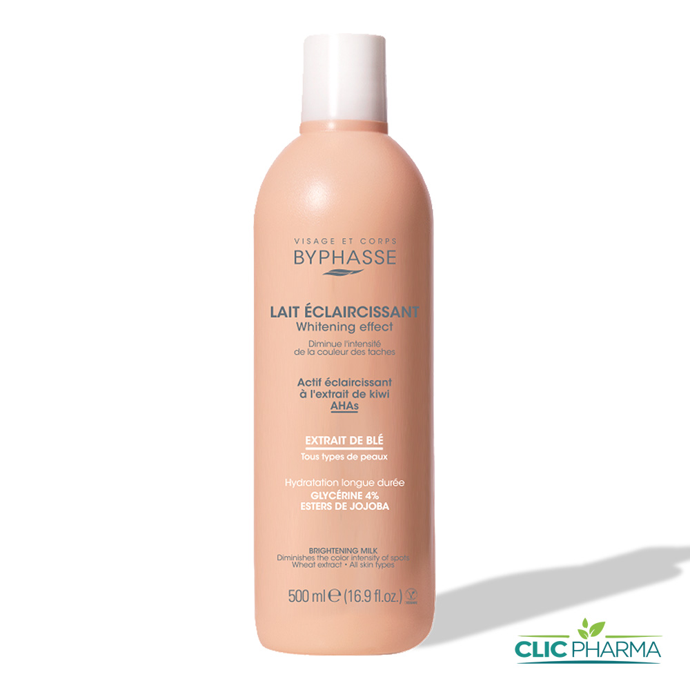 Le lait éclaircissant BYPHASSE à l’extrait de blé est conçu pour diminuer l’intensité de la couleur des taches sur le visage, le cou, les mains et le corps. Sa formule avancée combine un actif éclaircissant d’origine naturelle avec de l’allantoïne et des acides alpha-hydroxy (AHA) qui travaillent en synergie pour unifier le teint. Grâce à l’ajout de glycérine et d’esters de jojoba, il assure une hydratation prolongée, laissant la peau lisse, douce et visiblement plus claire sans laisser de film gras.