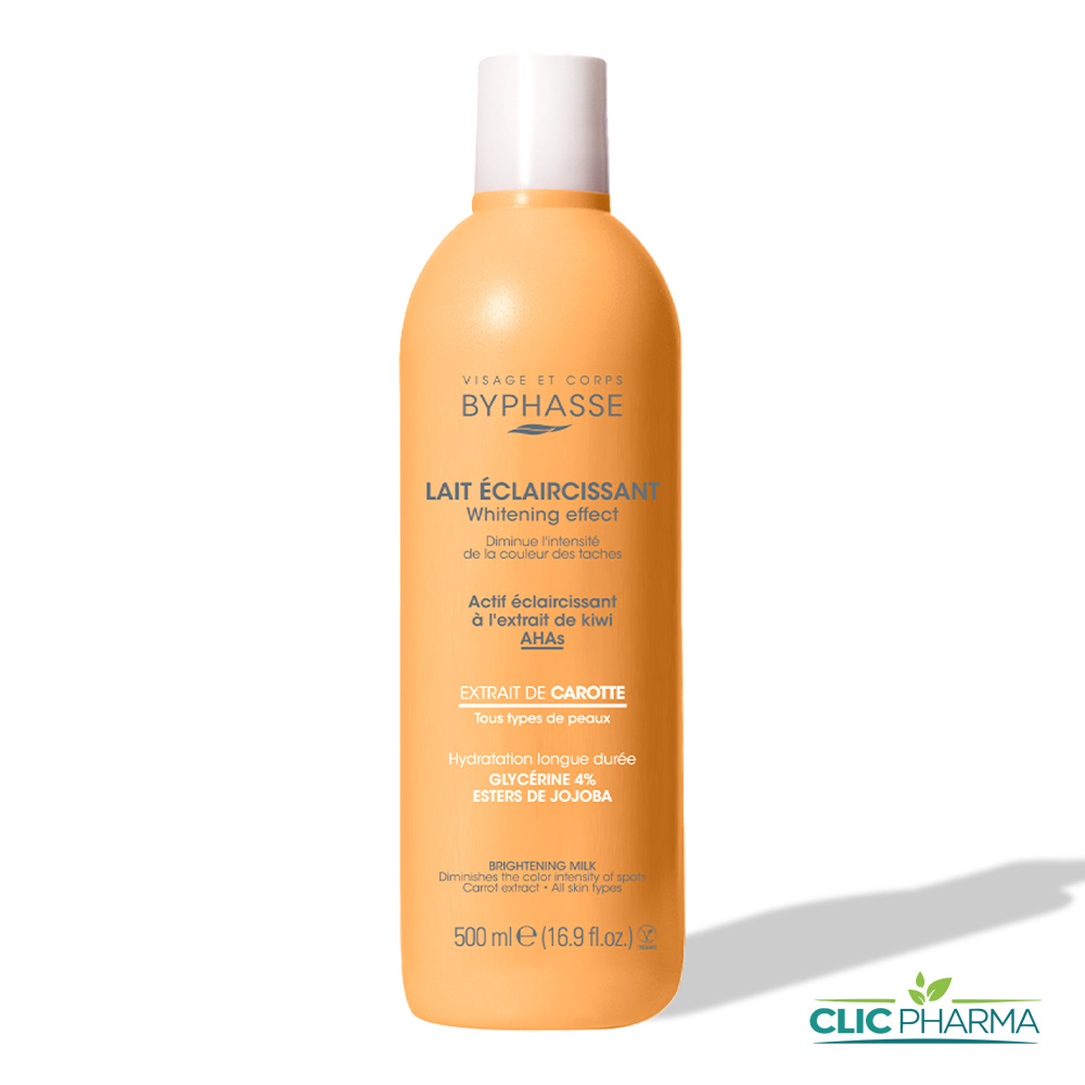 Le lait éclaircissant BYPHASSE à l’extrait de carotte est un soin ciblé pour diminuer l’intensité de la couleur des taches sur le visage, le cou, les mains et le corps. Sa formule experte associe un actif éclaircissant d’origine naturelle à de l’allantoïne et des acides alpha-hydroxy (AHA) pour uniformiser le grain de peau. Enrichi en glycérine et en esters de jojoba, il assure une hydratation longue durée tout en redonnant un aspect sain et lumineux à l’épiderme. Sa texture légère pénètre rapidement sans laisser de sensation grasse.