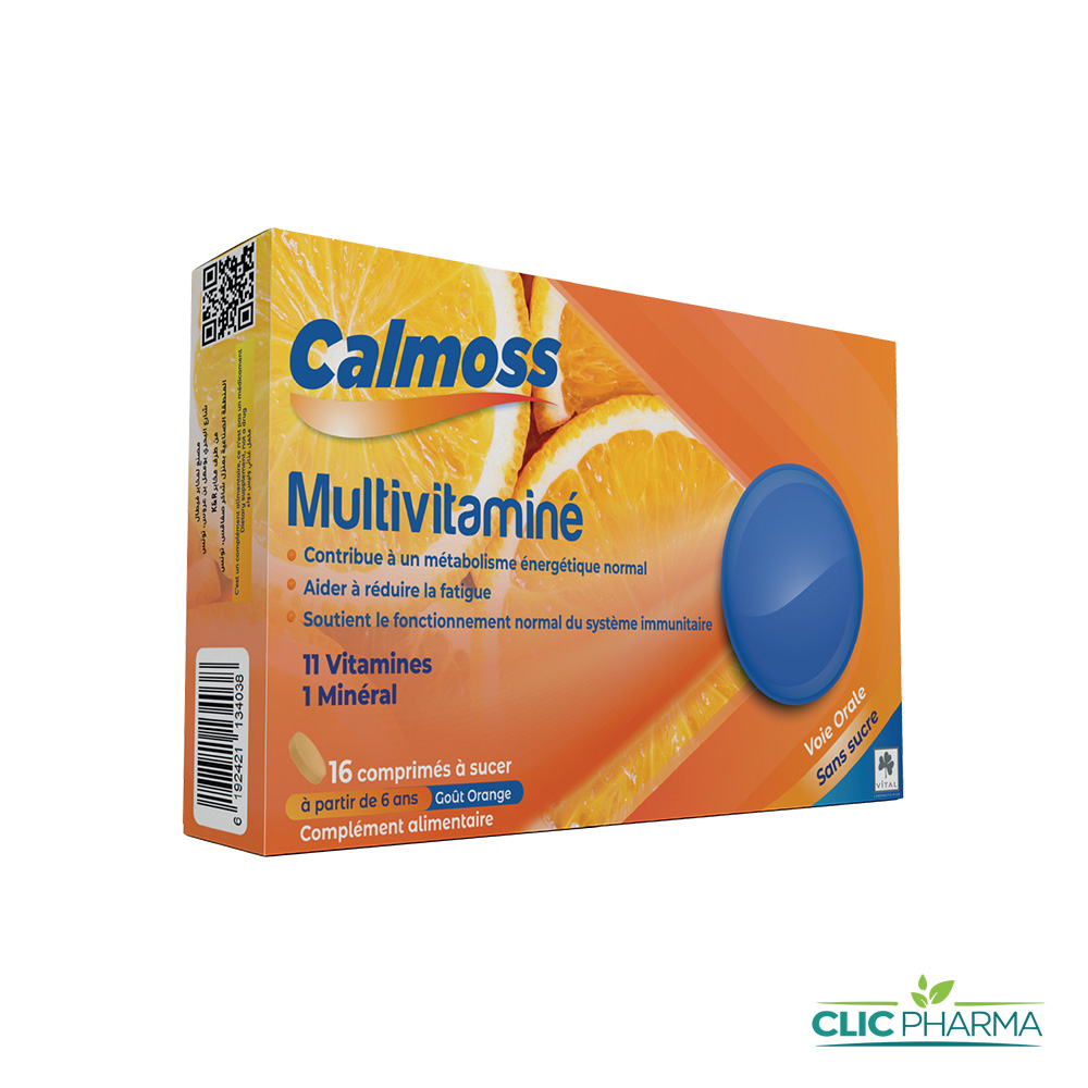 Calmoss Multivitaminé est un complément alimentaire conçu pour soutenir la vitalité quotidienne. Il se présente sous forme de comprimés à sucer au goût orange, offrant une solution pratique et sans sucre pour faire le plein de nutriments essentiels.