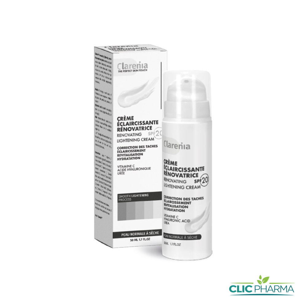 La crème éclaircissante rénovatrice peau normale a sèche de la marque Clarenia™ permet de corriger les tâches et prévenir leur répartition, d’hydrater la peau en surface et en profondeur, réduire les effets néfastes des UV grâce à une protection solaire SPF 20 et augmenter les bénéfices des traitements dépigmentants.