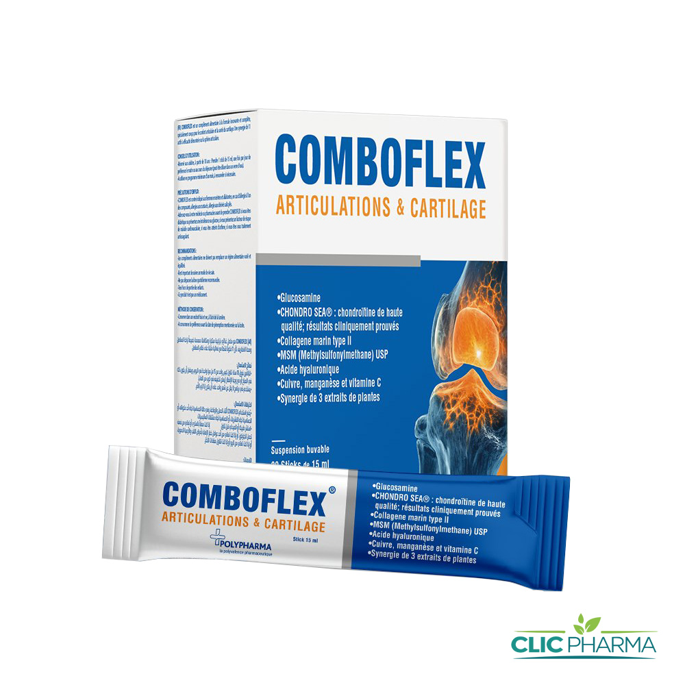 ComboFlex Articulation & Cartilage de Polypharma est un complément alimentaire formulé pour soutenir la mobilité articulaire et préserver la souplesse du cartilage. Sa formule associe des actifs reconnus pour contribuer au confort articulaire au quotidien.