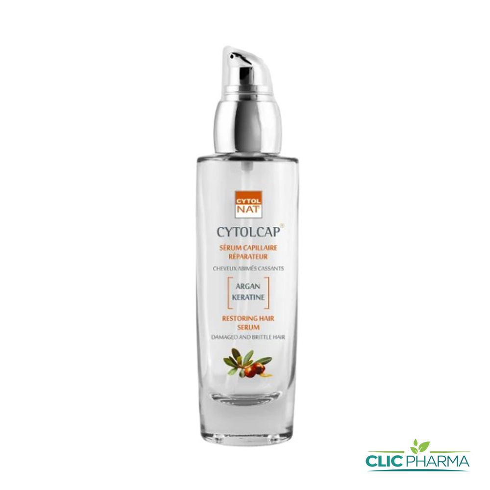 CYTOLCAP sérum est un soin capillaire réparateur spécialement conçu pour les cheveux fragiles, abîmés et cassants.PropriétésEnrichi à la kératine végétale, constituée de protéines et d’acides aminés, et à l’huile d’argan, exceptionnellement riche en acides gras essentiels et en vitamine E, CYTOLCAP sérum pénètre au cœur de la fibre capillaire, nourrit intensément la chevelure et apporte une brillance intense.Bienfaits   Renforce la fibre capillaire.   Protège les cheveux des agressions extérieures (rayons UV, pollution, sèche cheveux).   Lutte contre la casse des cheveux.   Hydrate les cheveux et les pointes sèches.   Nourrit les cheveux et leurs apporte douceur et brillance.