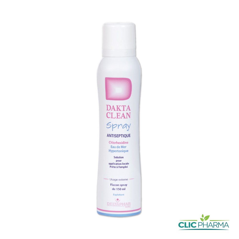 DAKTA CLEAN Spray Antiseptique est une solution a base d’eau de mer hypertonique, il est conçu pour nettoyer et désinfecter les plaies, éraflures, coupures, les ampoules, les écorchures ou les soins généraux après circoncision C’est aussi un traitement d’appoint des affections de la peau et des muqueuses primitivement bactériennes ou susceptible de se surinfecter.