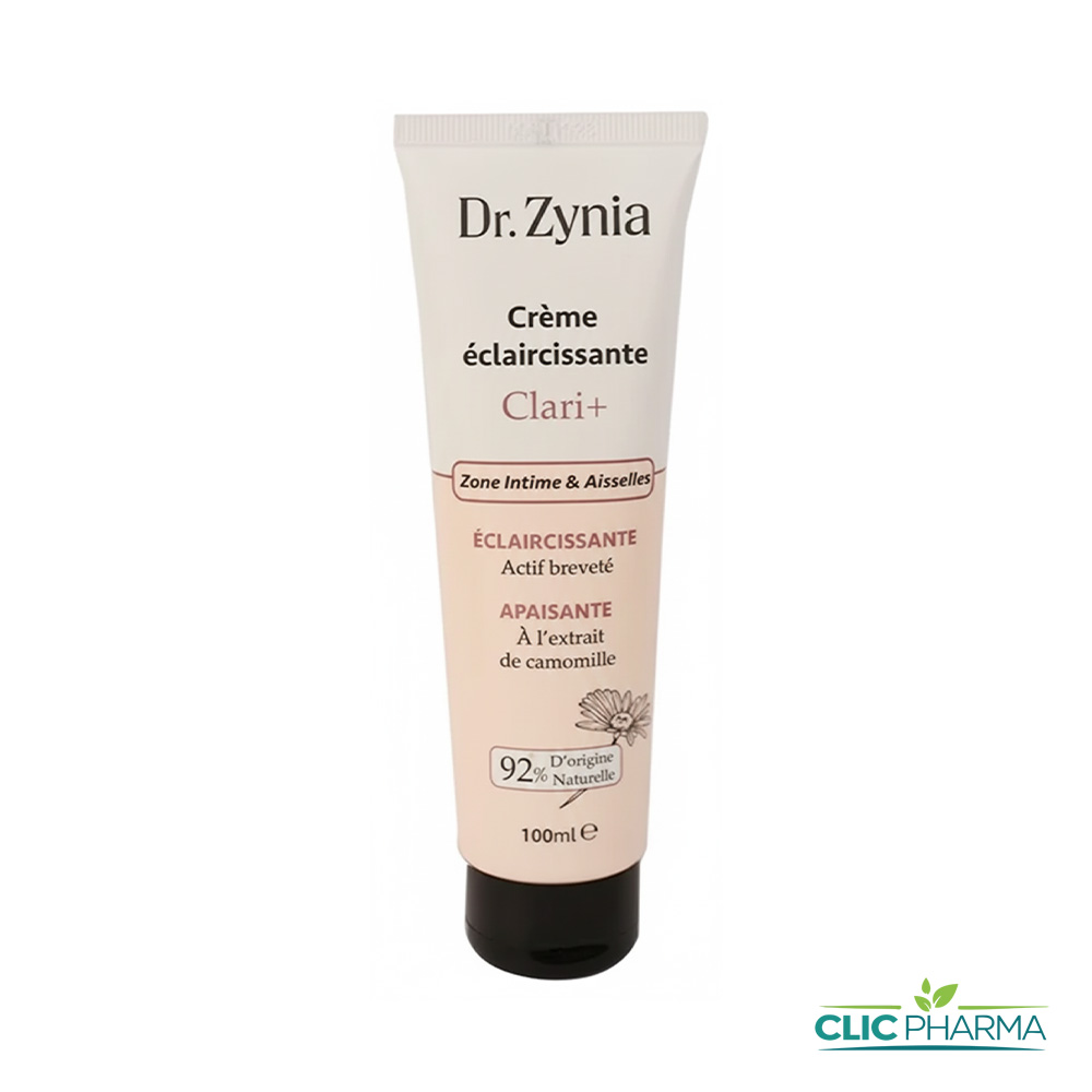 Découvrez la Crème Éclaircissante Dr. Zynia Clari+, un soin ciblé pour éclaircir les zones intimes et les aisselles, unifier le teint et apaiser la peau grâce à sa formule douce à 92 % d’origine naturelle.