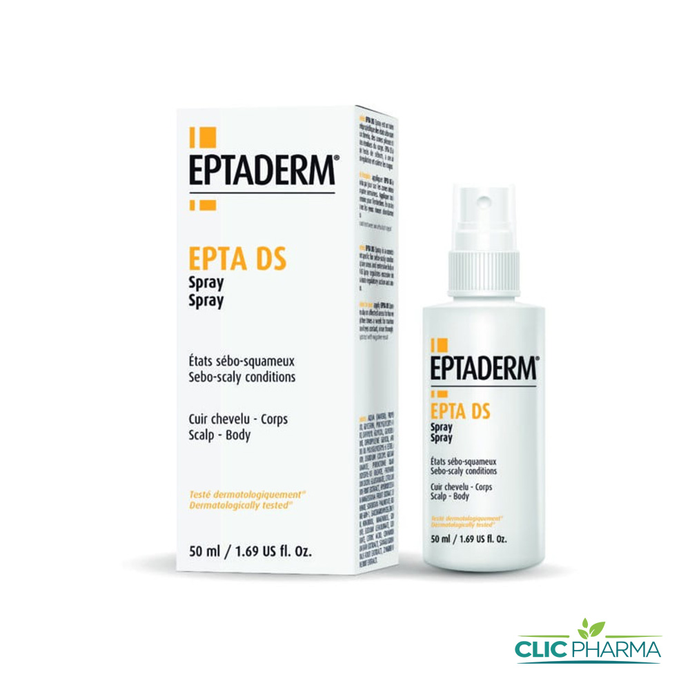 EPTA DS Spray est une lotion cosmétique sans alcool spécialement conçue pour le traitement des états séborrhéiques et sébo-desquamatifs du cuir chevelu, des zones pileuses et des surfaces étendues difficiles à traiter par crème. Sa formule complète agit pour réguler l’excès de sébumnormaliser le renouvellement cellulaire et apaiser les rougeurs et irritations. Sans parfum ni parabens, elle assure une tolérance optimale, même sur les peaux sensibles.