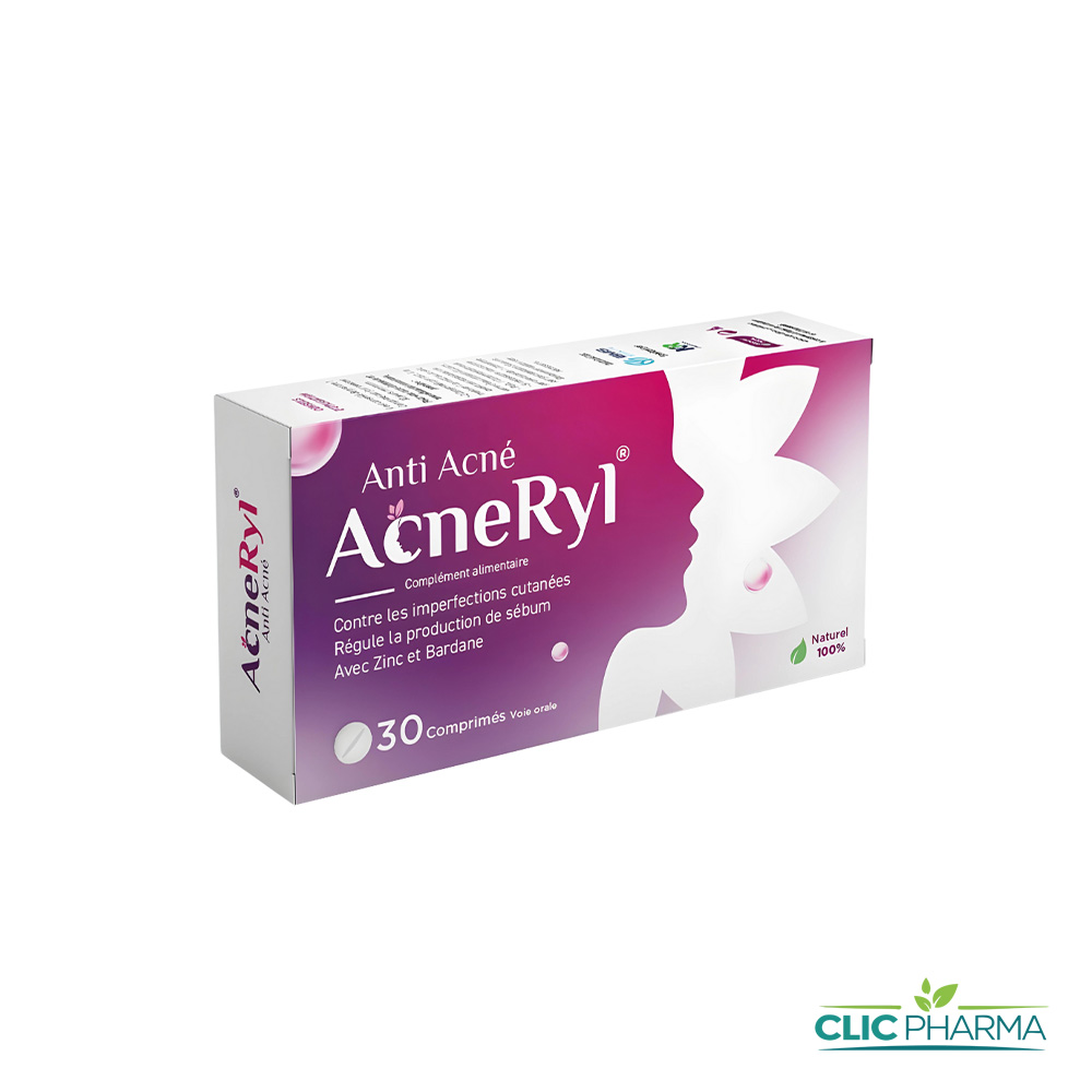 Acneryl est un complément alimentaire conçu pour rééquilibrer et purifier la peau à problèmes. Grâce à sa formule à base de plantes, de zinc et de pro-vitamine A, il aide à réguler la production de sébum, à limiter les imperfections et à assainir la peau en stimulant naturellement les processus de détoxification.