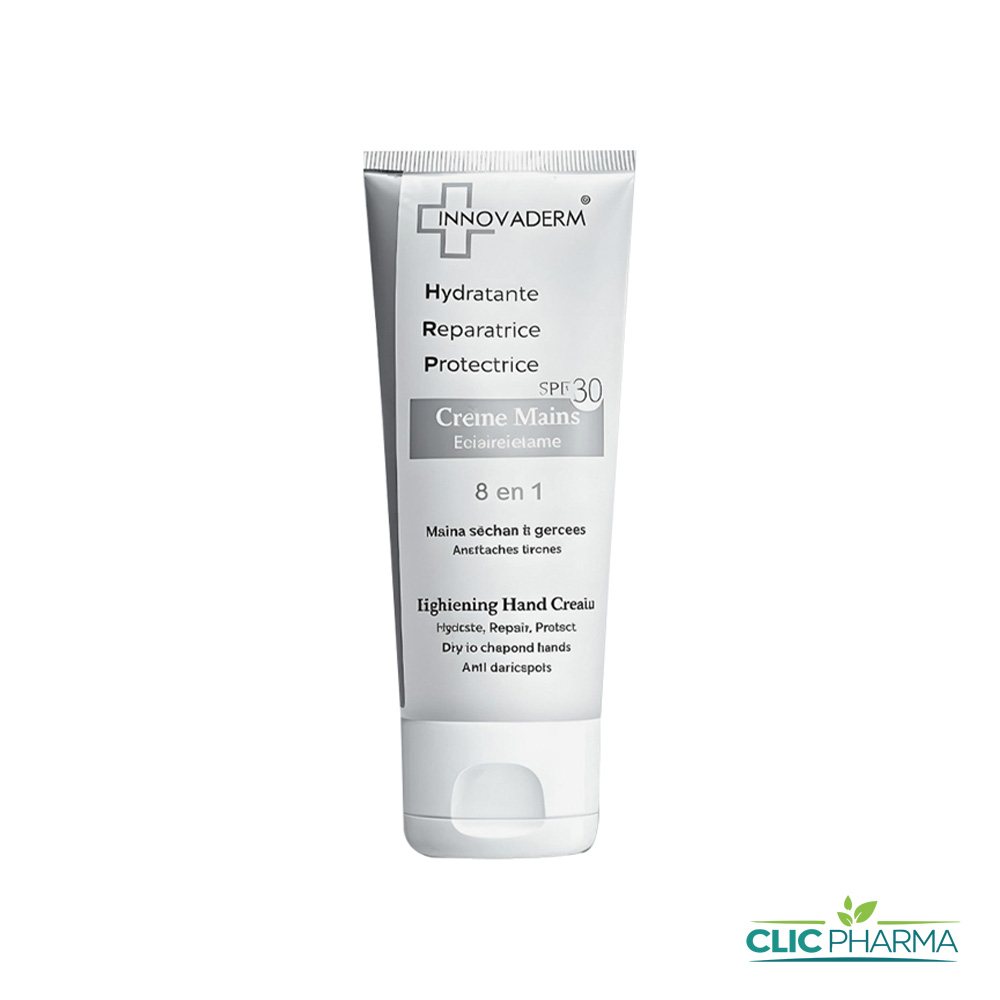 Innovaderm Crème Mains Éclaircissante SPF30 – 100 ml est un soin complet qui hydrate, répare et protège les mains sèches et gercées, tout en agissant sur les taches brunes pour un teint plus uniforme. Sa formule inclut un indice SPF30 pour prévenir l’apparition de nouvelles taches dues aux rayons UV.