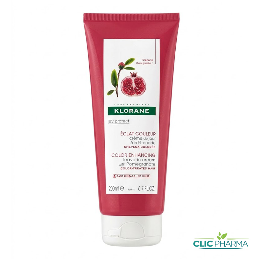 KLORANE CREME DE JOUR A LA GRENADE est sans rinçage, Fixateur, protecteur, couleur prolongée Soin quotidien sublimateur de reflets des cheveux colorés, cette crème de jour nourrit la fibre et magnifie la couleur. Les perles de nacre intensifient l’éclat et le filtre UV hautement concentré protège la coloration de l’oxydation.