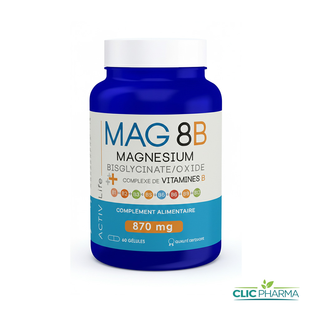 MAG 8B est un complément alimentaire conçu pour optimiser l’apport en magnésium en combinant deux formes complémentaires du minéral avec un complexe complet de vitamines B.