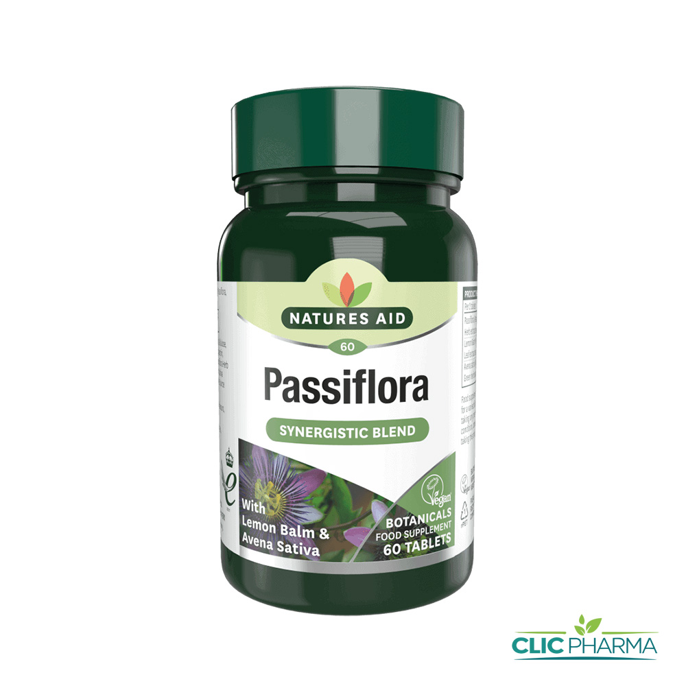 Natures Aid Passiflora Complex fournit 250mg de Passiflora, Mélisse et Avena Sativa.