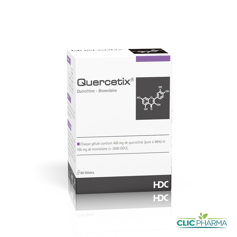 Complément alimentaire à base de Quercétine et Bromelaïne. La quercétine possède des propriétés anti-inflammatoires. Elle présente également des propriétés antivirales. Elle stimule le système immunitaire. La bromelaïne, enzyme protéolytique favorise l’absorption de la quércetine.