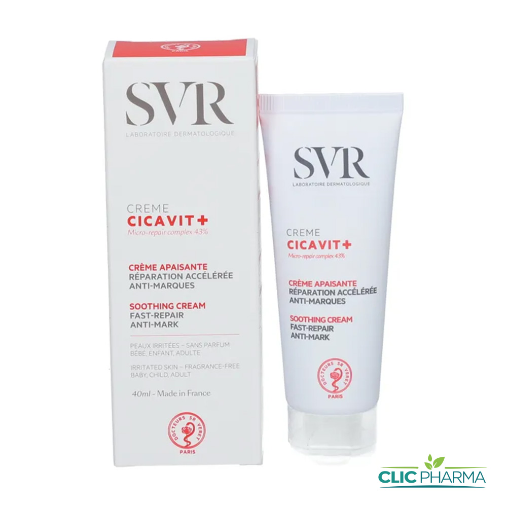 SVR Cicavit+ Crème Apaisante Réparation Accélérée Anti-Marques 40 ml est un soin élaboré pour apaiser et assainir les peaux irritées suite à des altérations cutanées superficielles des bébés, enfants, adultes.