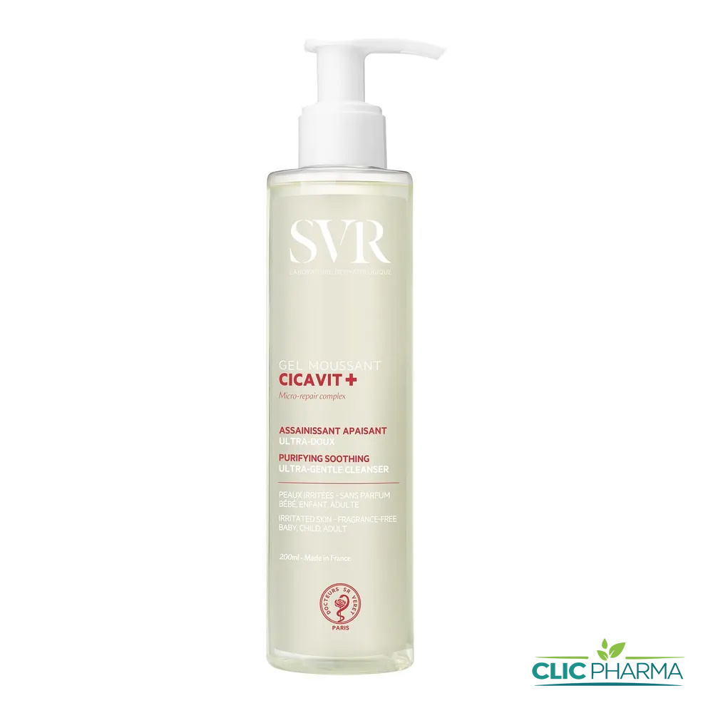 SVR Cicavit+ Gel Moussant 200 ml est un gel nettoyant assainissant et apaisant spécialement formulé pour les peaux irritées et fragilisées de toute la famille. Grâce à sa mousse onctueuse et ultra-douce, il élimine en douceur les impuretés tout en respectant le film hydrolipidique et l’équilibre du microbiote cutané.