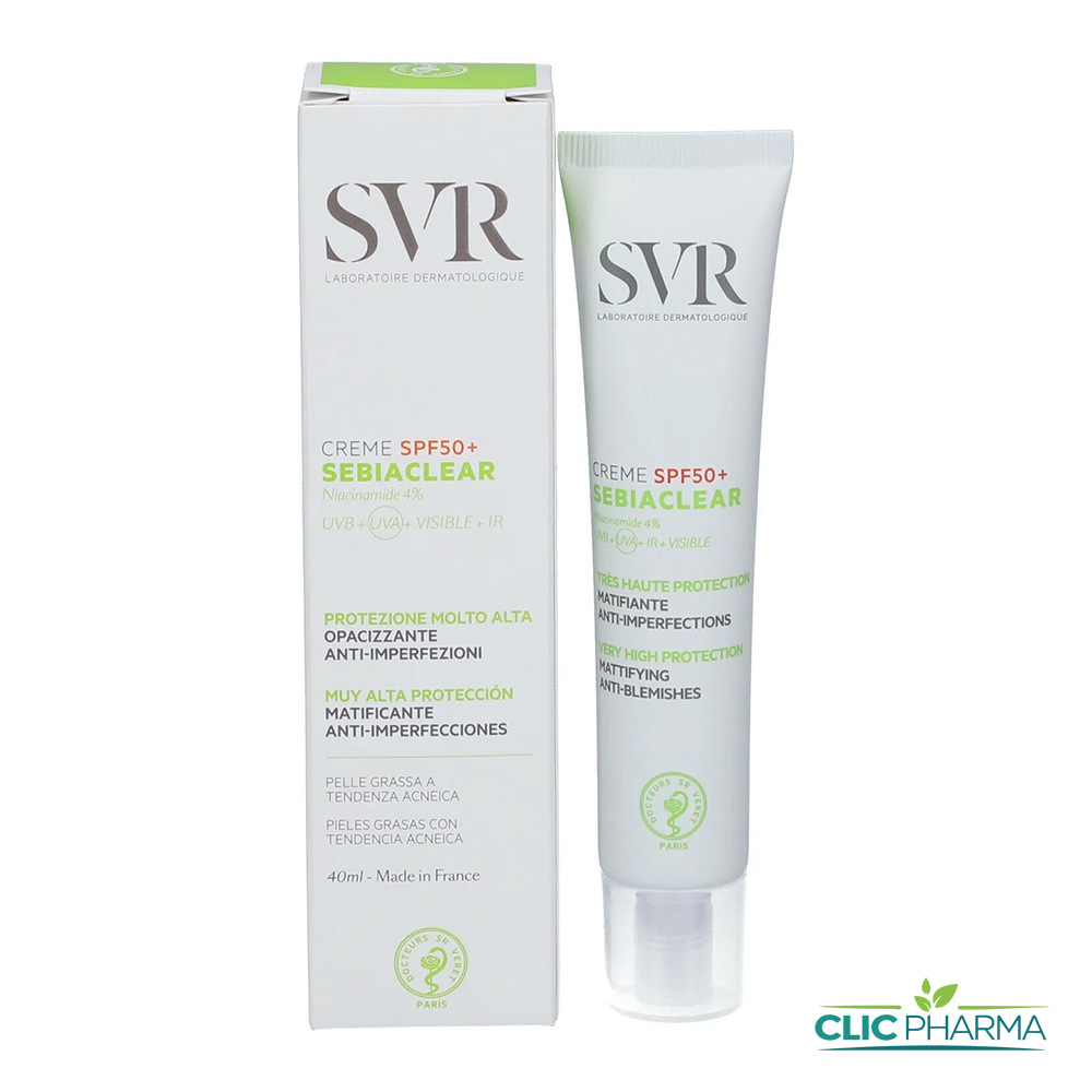 - Sebiaclear creme SPF50 de SVR protège et corrige les peaux sensibles, mixtes à grasses à imperfections.