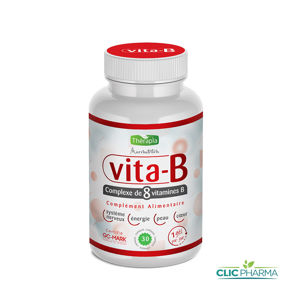 Therapia Vita-B est un complément alimentaire présenté sous forme de boîte de 30 gélules. Il est formulé à base d’un complexe de 8 vitamines du groupe B pour soutenir le métabolisme énergétique et le bon fonctionnement du système nerveux.