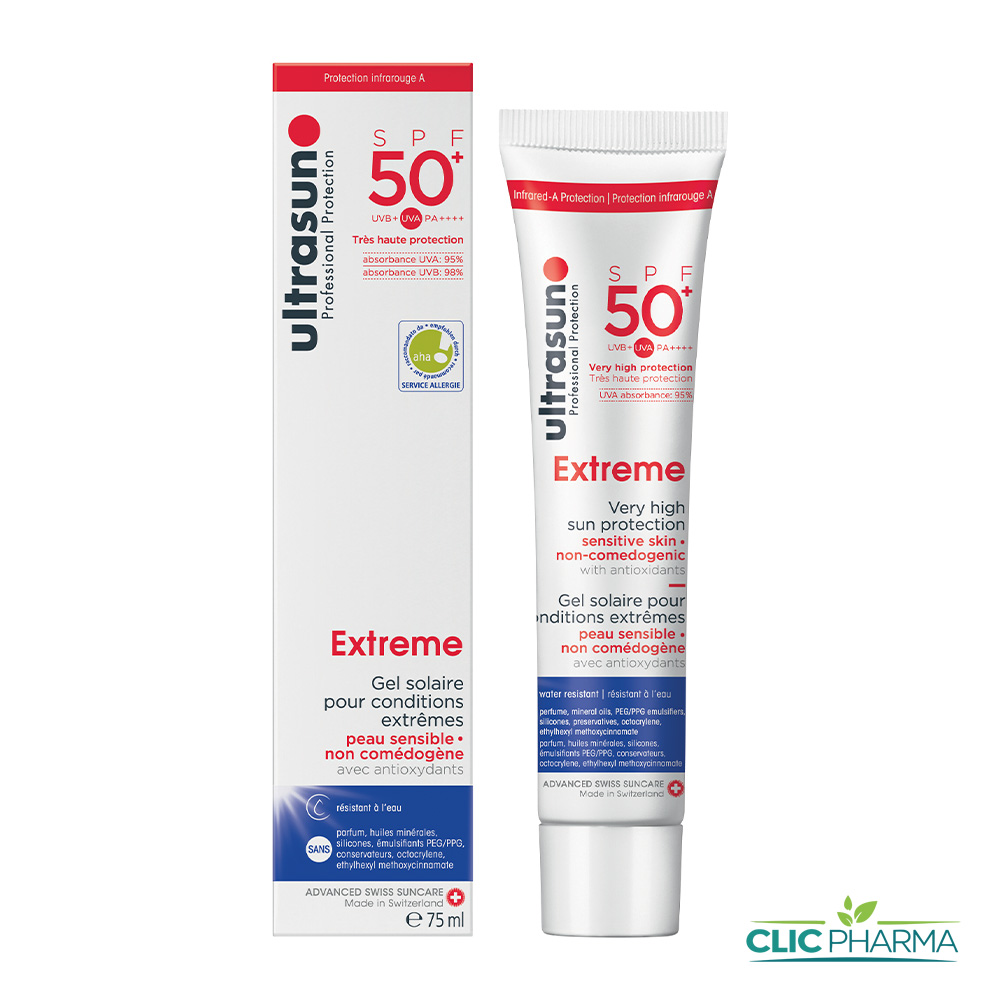 ULTRASUN Extrême Gel Solaire SPF50+ 75ml est destiné pour les peaux ultra sensibles à absorption rapide, non gras et non collant, contenant de la SOD (anti-radicaux libres), de la vitamine E et de la provitamine B5. Idéal dans les conditions d’ensoleillement extrêmes.