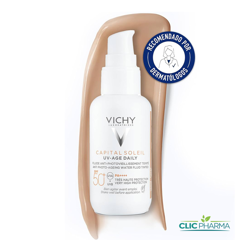 Vichy Capital Soleil UV-Age daily Fluide solaire anti-âge SFP 50+ teinté est à la fois un anti-âge et une protection solaire. En effet, il offre un haut degré de protection contre les UV et il a une action préventive contre les taches et les rides. Par ailleurs, il unifie le teint.