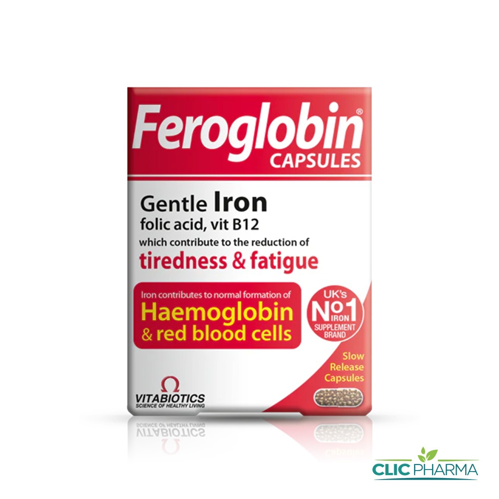 Les VITABIOTICS Feroglobin Capsules (boîte de 30) sont un complément alimentaire hématinique conçu pour soutenir la formation des globules rouges et de l’hémoglobine tout en restant doux pour l’estomac.